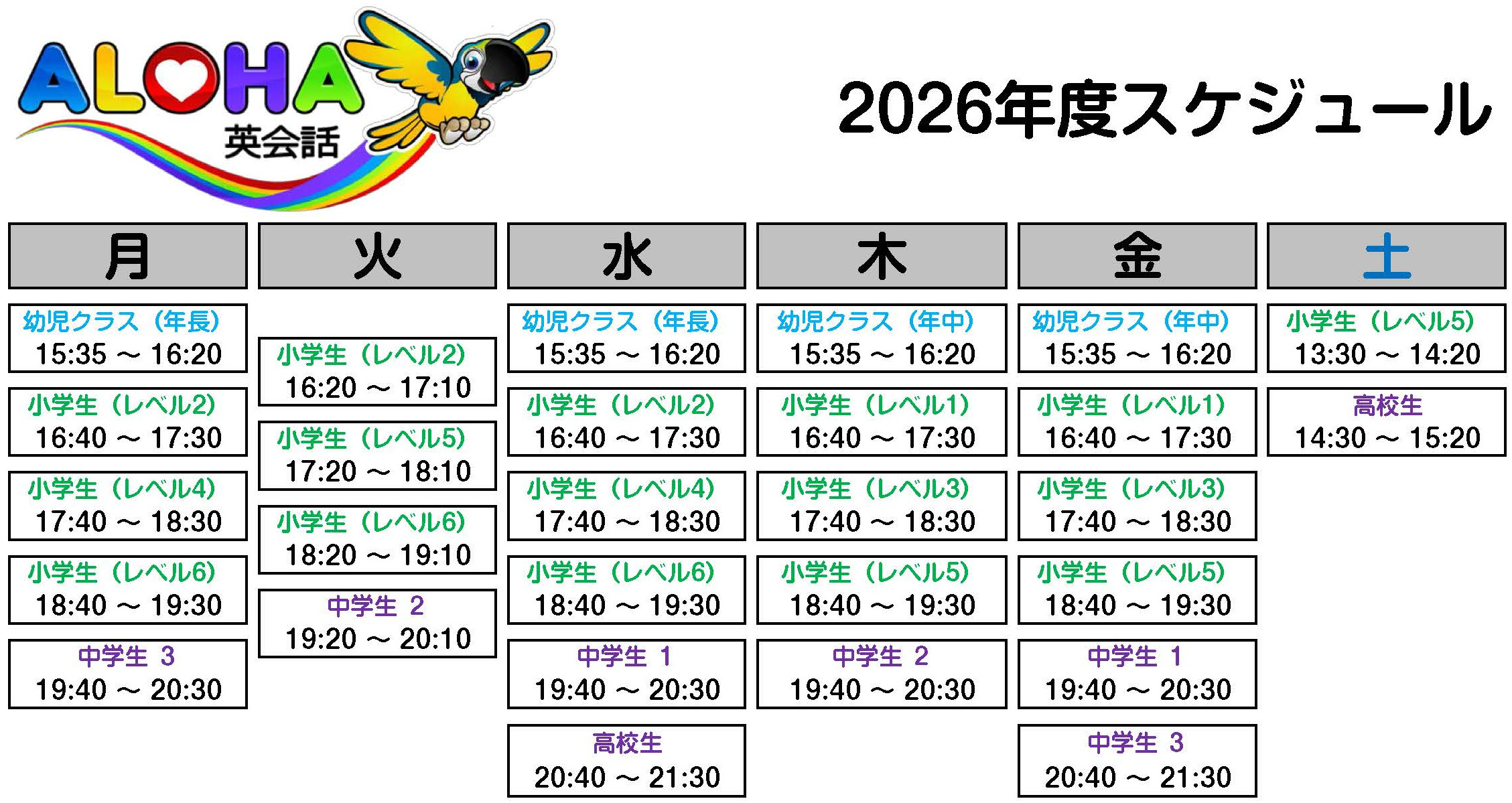 体験は既存クラスで行いますので、ご希望の方は下記のスケジュール表を
